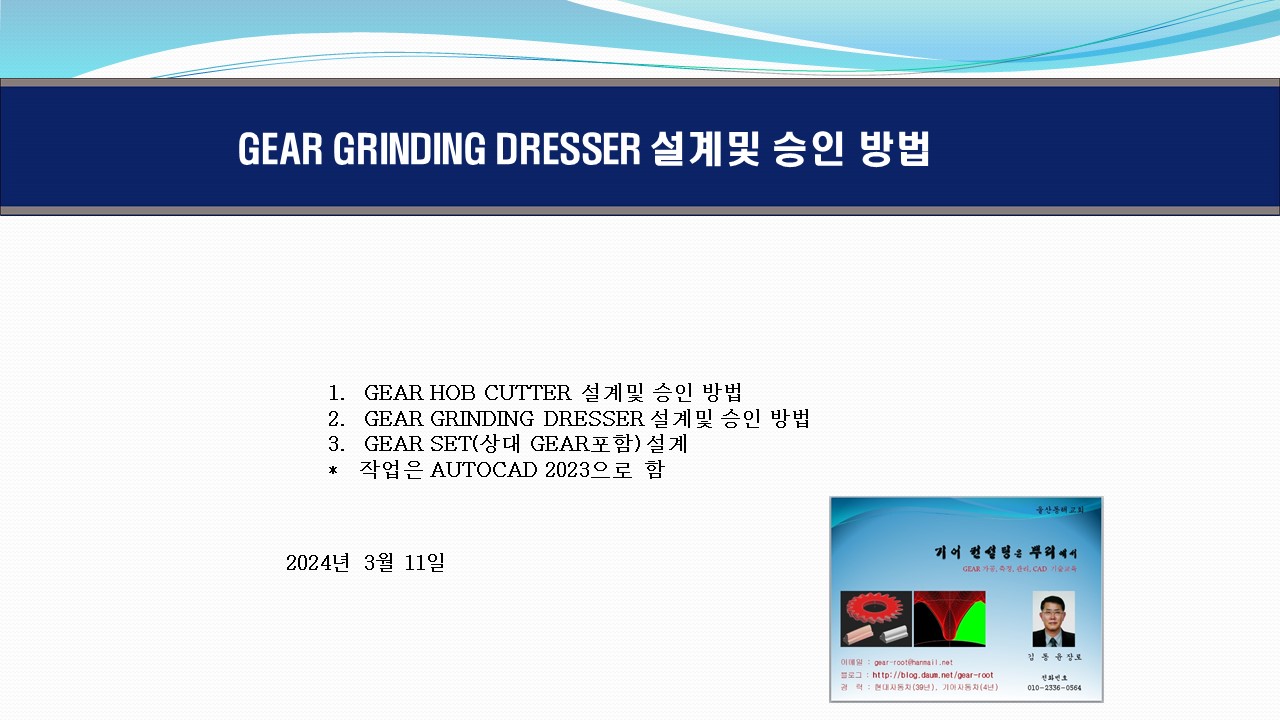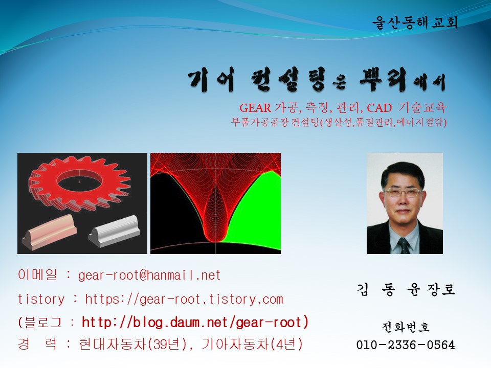 GEAR 교육, 기어 컨설팅, 기어 측정, 기어 품질관리, 기어설계 자동차 부품 품질관리, 공정관리, 생산성향상 GEAR는 톱니바퀴를 말한다. 즉 원반의 외주에 등간격의 톱니를 붙인것을 말하며, 일반적으로 한쌍으로회전하며, 한 기어의 톱니는 다른 기어의 톱니와 맞물리면서 회전운동과회전력을 미끄러짐 없이 전달하면서, 회전수를 가감하거나 회전력을 가감한다. 대부분의 기어는 원형이다. 항상 일정한 속도비로 운동을 부드럽게 전달하기위해서 기어 톱니의 접촉면을 특정한 형태로 정확하게 만들어야 한다.각기 다른 축 배열에 따라 그에 알맞은 기어를 만든다. 축이 평행하면 길이방향으로 곧고 축에 나란한 톱니를 가진 평 기어나 톱니가나사처럼 비틀린 헬리컬 기어로 연결한다. 본 불러그에서는 이와같은 원통치차의 내치차..